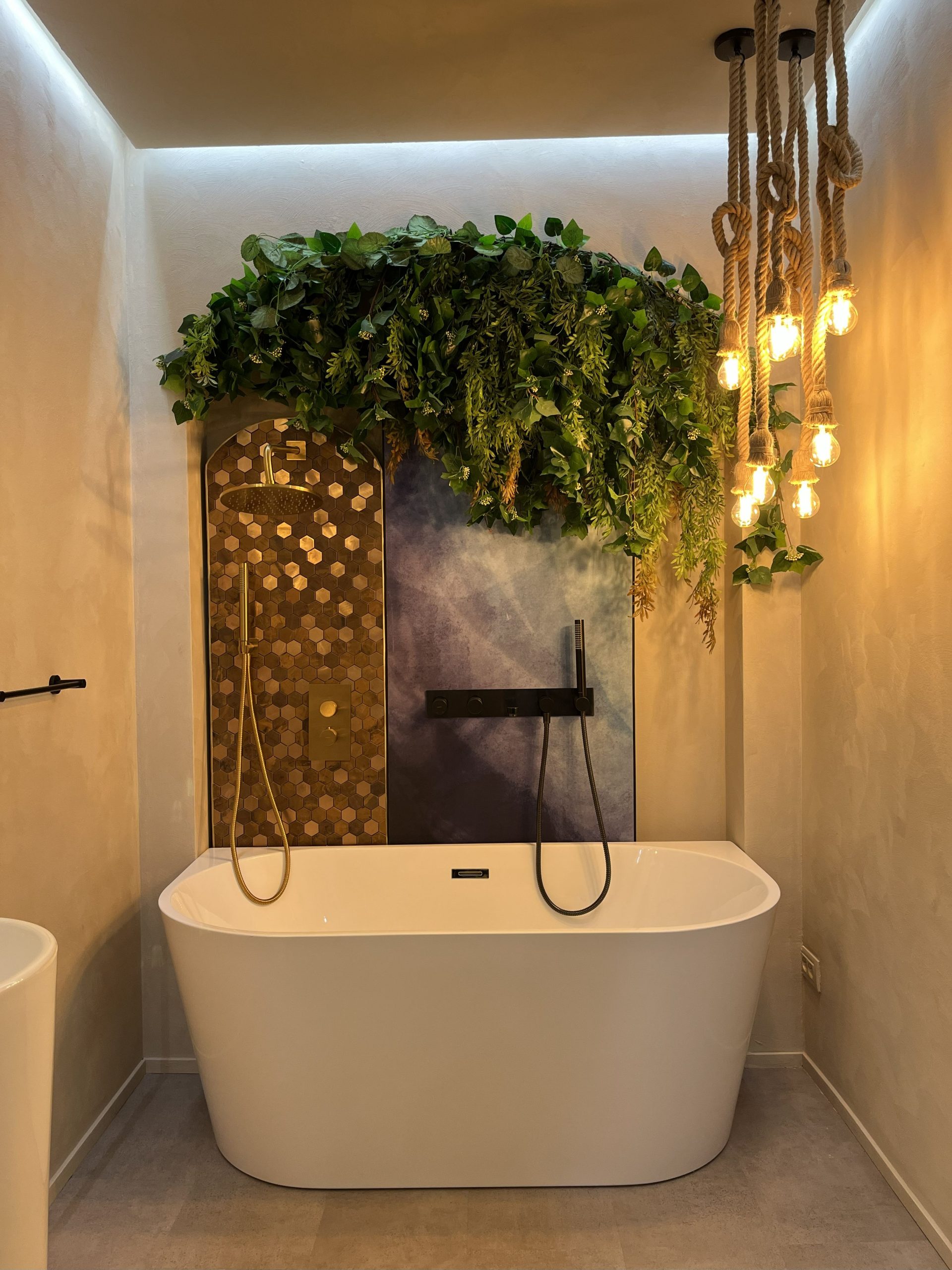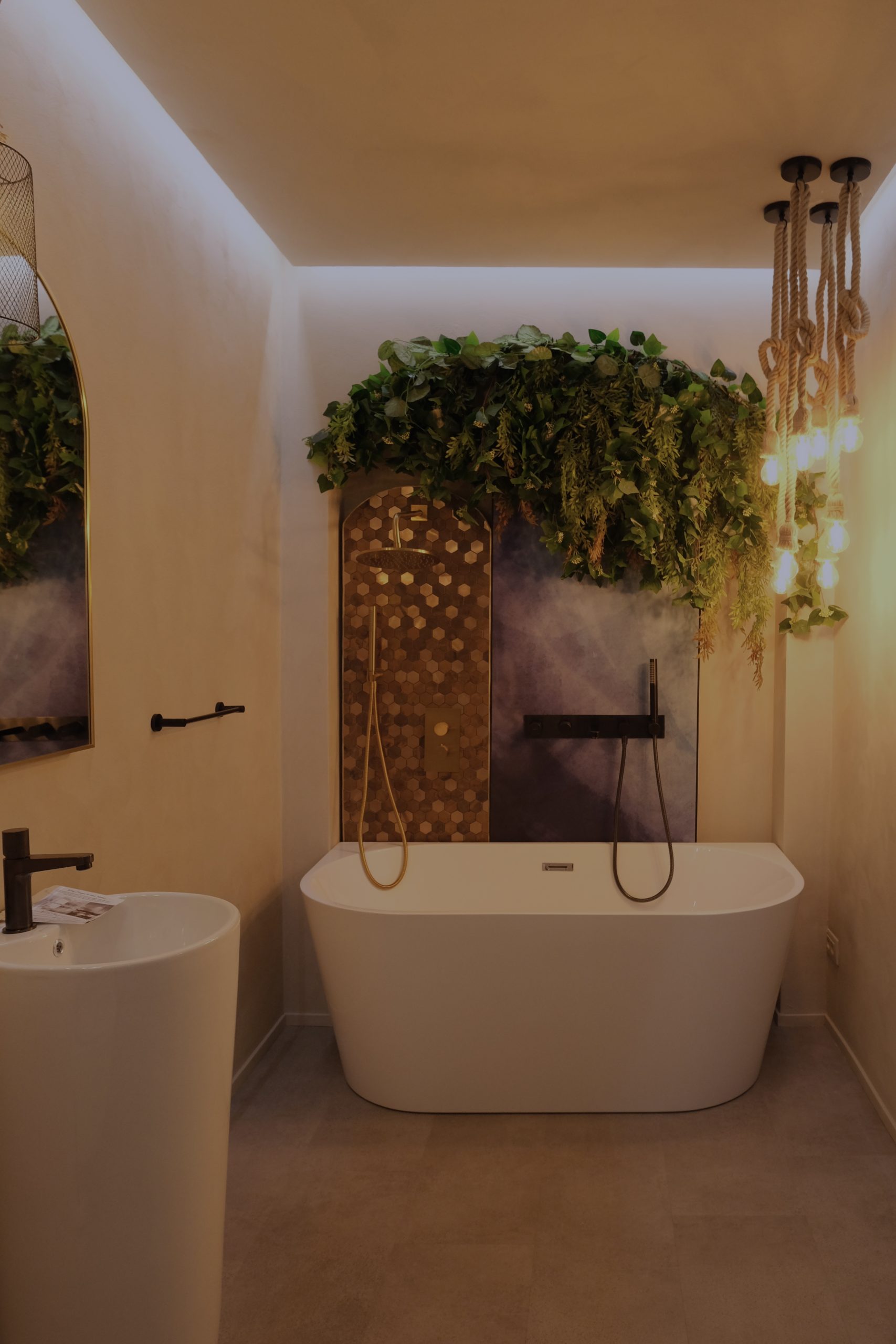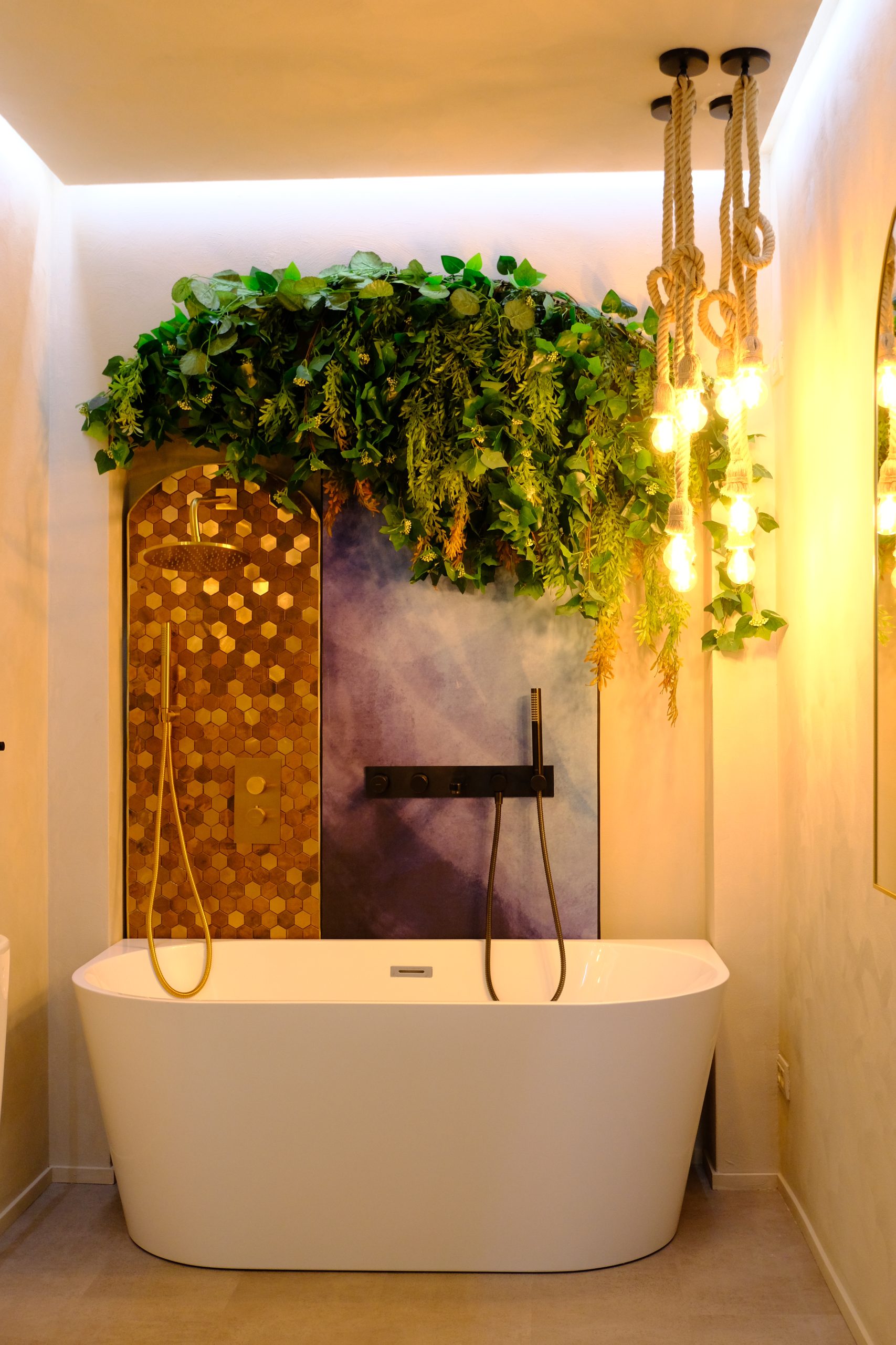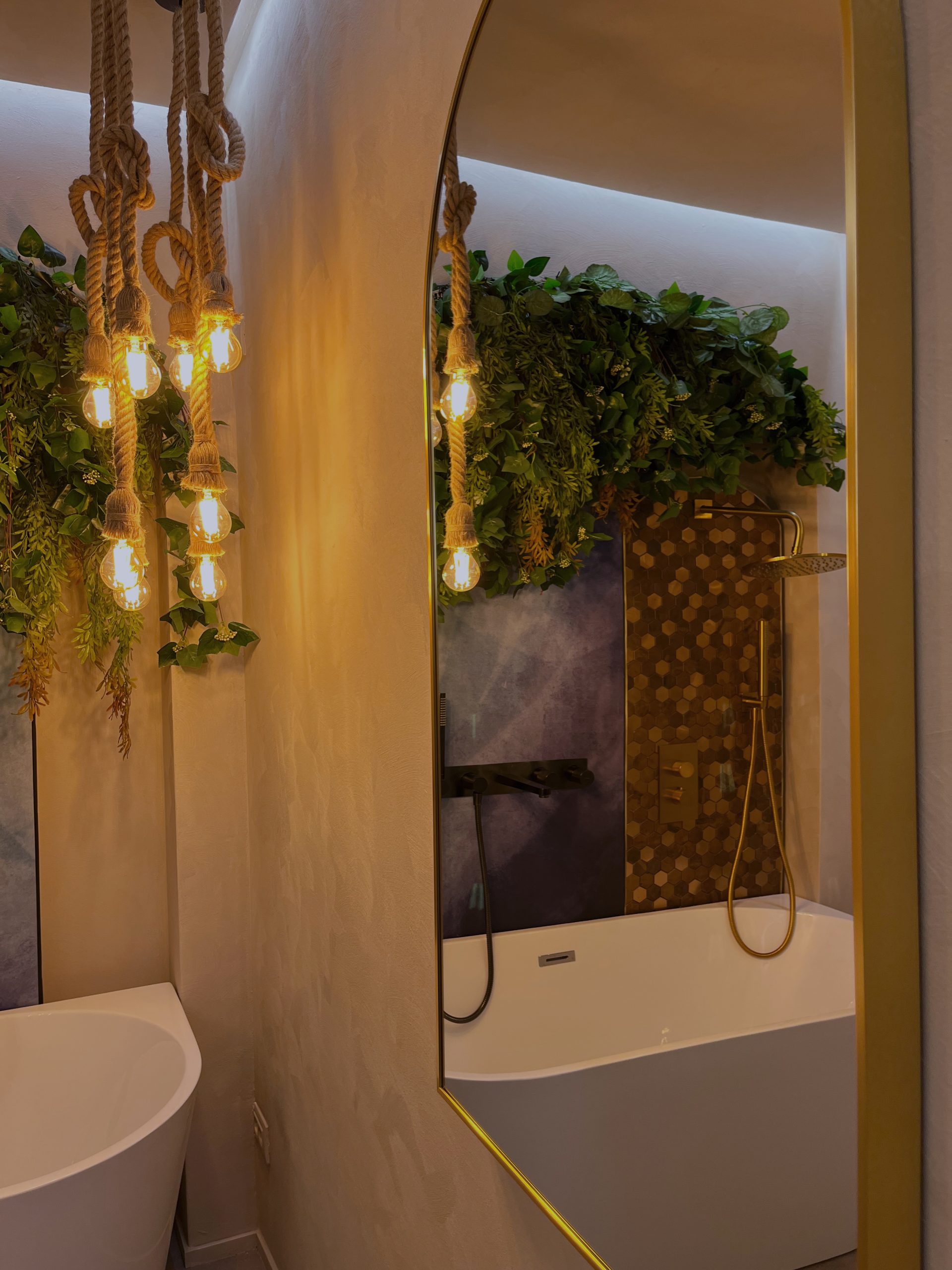 Într-o cămăruță relativ mică, am reușit să creez un ambient bogat și expresiv: o cadă elegantă, plante decorative care aduc viață, panouri decorative cu tapet și mozaic tip alamă cu reflexe aurii, lustre suspendate tip șfori care dau un aer boem, plante (multe!), un lavoar freestanding, oglinzi care adaugă adâncime, ba chiar puncte de selfie pentru experiența vizitatorului.