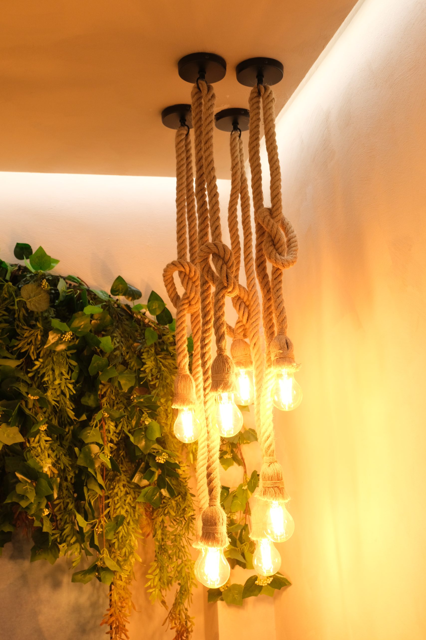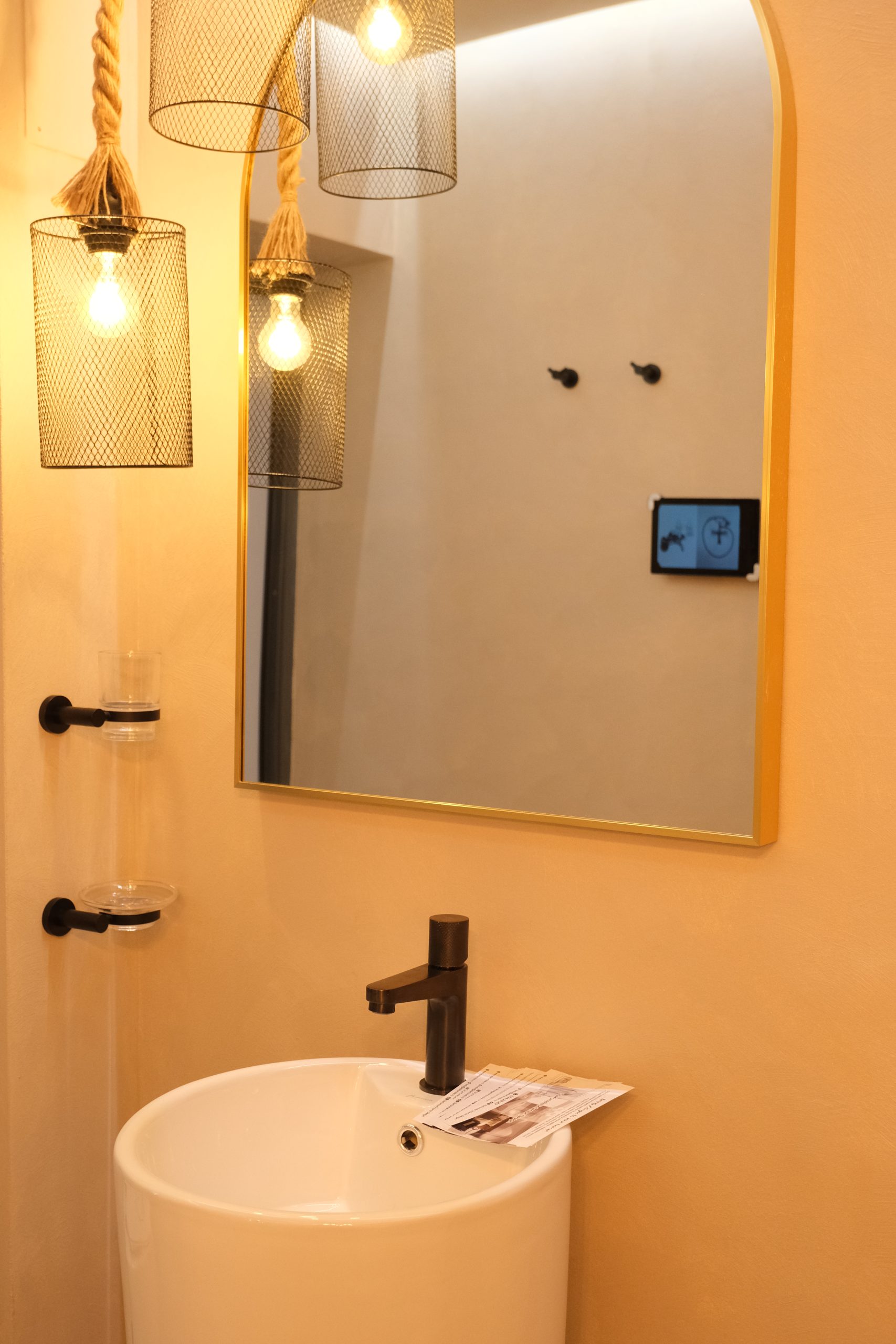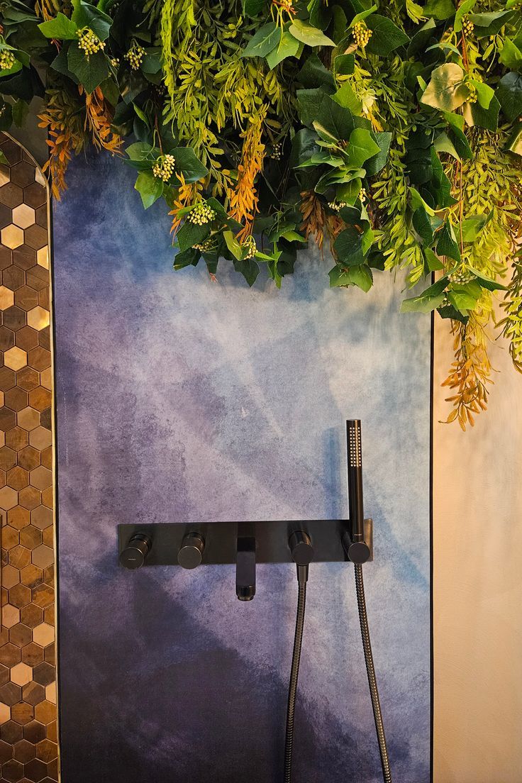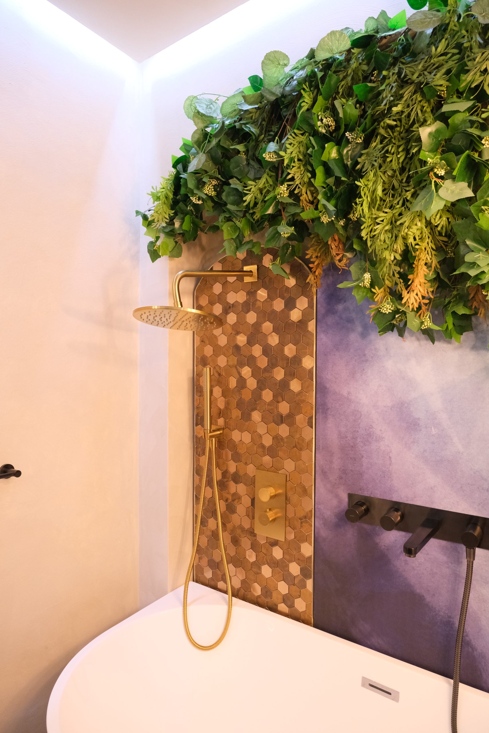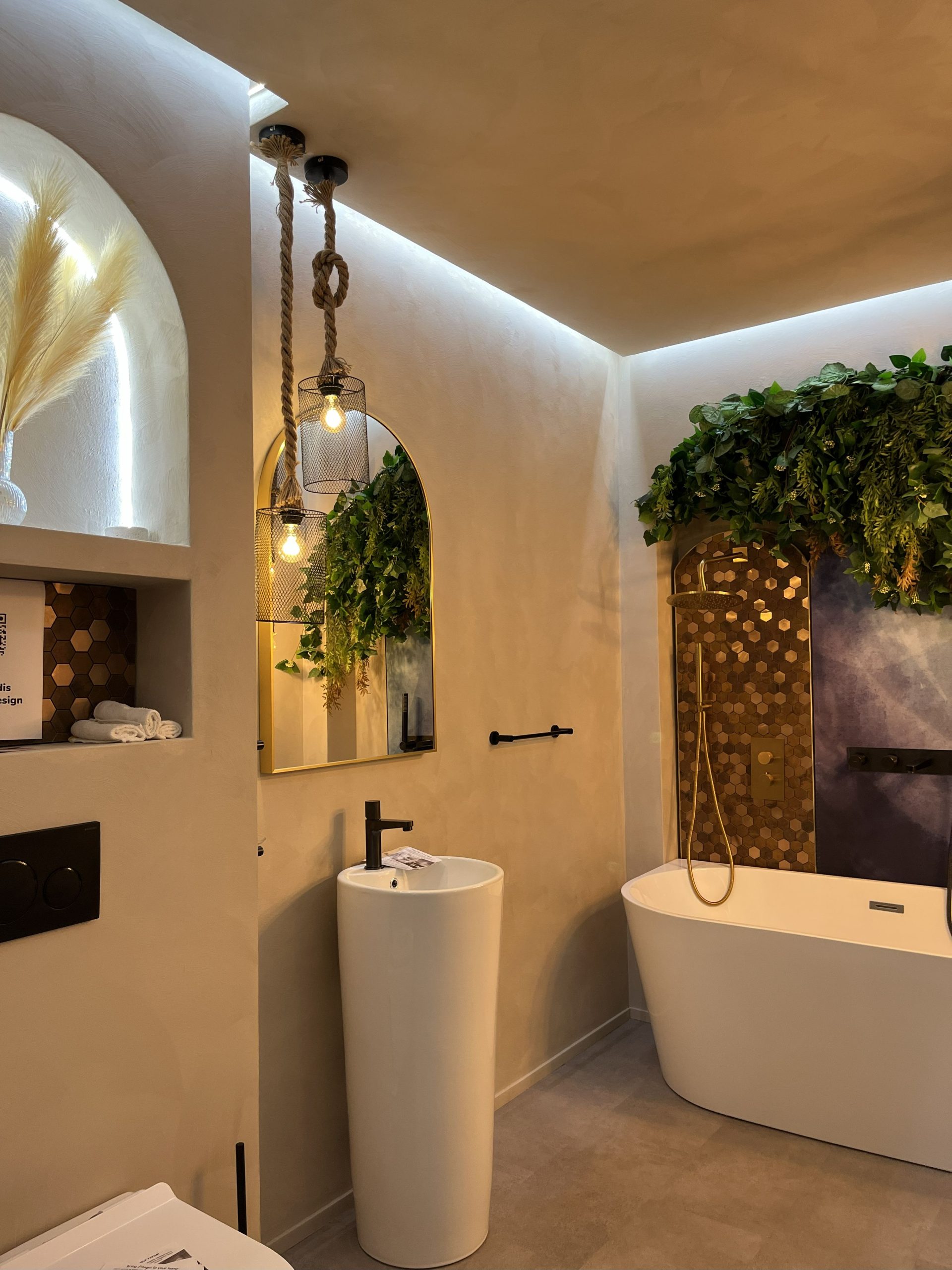 Într-o cămăruță relativ mică, am reușit să creez un ambient bogat și expresiv: o cadă elegantă, plante decorative care aduc viață, panouri decorative cu tapet și mozaic tip alamă cu reflexe aurii, lustre suspendate tip șfori care dau un aer boem, plante (multe!), un lavoar freestanding, oglinzi care adaugă adâncime, ba chiar puncte de selfie pentru experiența vizitatorului.